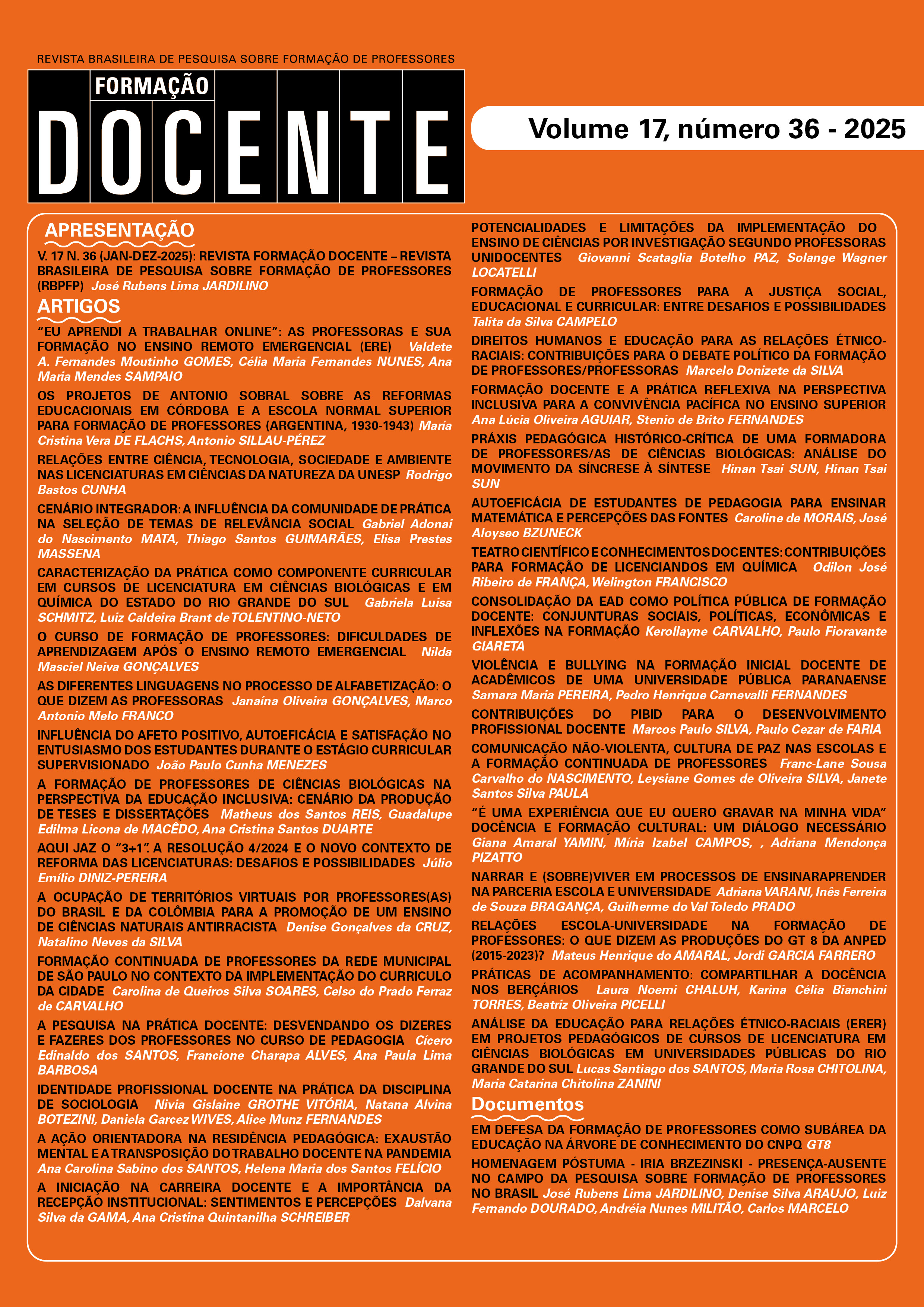 Esperamos que este número que ora apresentamos da Formação Docente –Revista Brasileira de Pesquisa sobre Formação de Professores, seja relevante para o debate no campo, e possibilite a reflexão para os investigadores que atuam pesquisando sobre a Formação de Professores na América Latina.